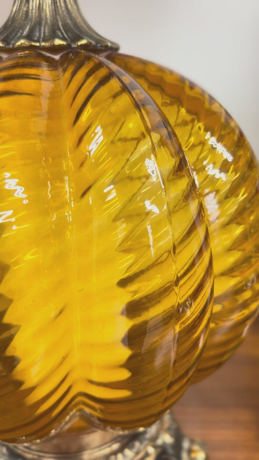 Vintage amber glass lamp. Ornate metal and glass base with a new linen shade. This is gorgeous!